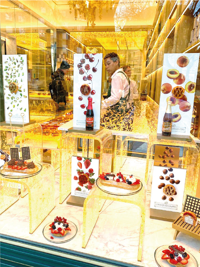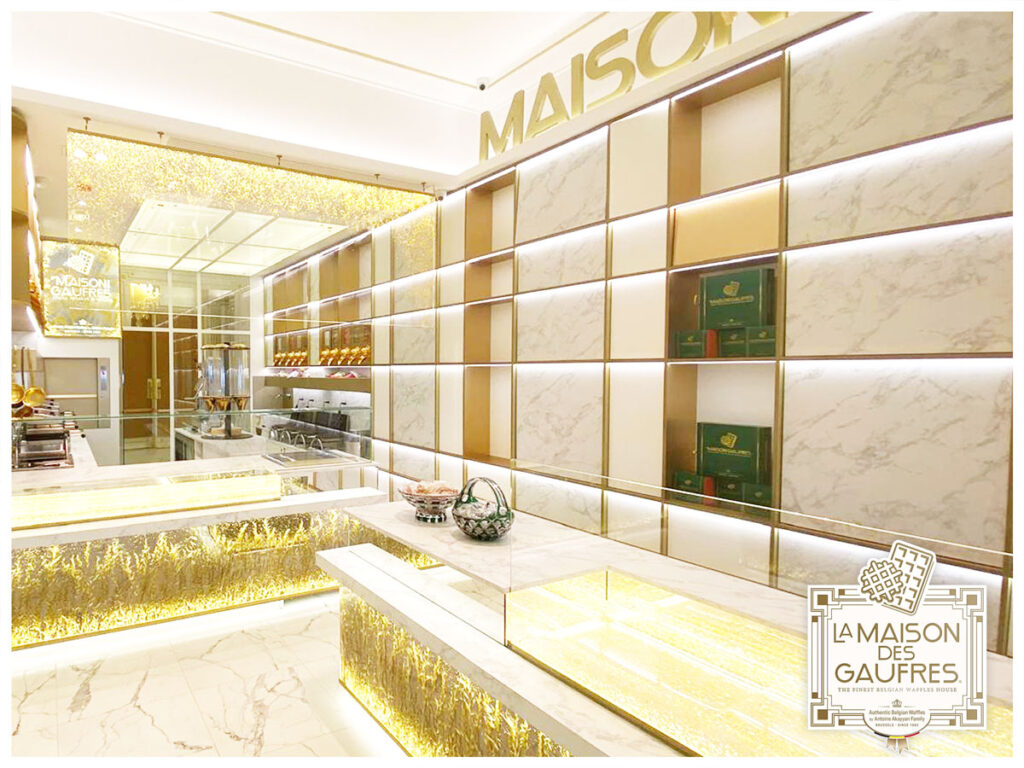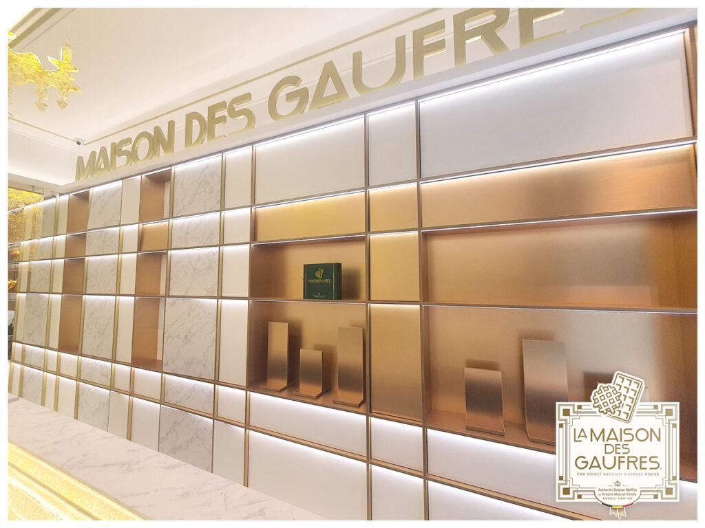 When you walk through the door of La Maison des Gaufres, you will see a gold décor, reminiscent of the colour of waffles: warm and bright. The tables, which are inlaid with crystal and 24-carat gold, were designed by Antoine Akayyan, and feature ears of wheat and oats, in homage to the creator’s history, a symbol of resilience and prosperity. Hanging on the walls, you will also see waffle irons from the past.