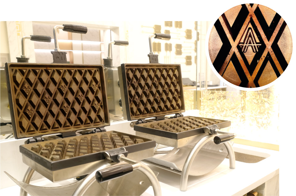 De signatuur van La Maison des Gaufres is een op maat gemaakte ambachtelijke wafelijzer, geïnspireerd op historische modellen, vervaardigd uit uitzonderlijke materialen en met de initialen van Antoine Akayyan.